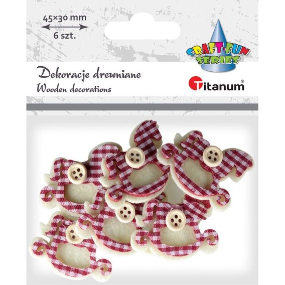 Aplikacje z filcu w kształcie koników na biegunach, z ozdobnym drewnianym guzikiem. Wymiary: 40x35 mm, czerwono-beżowe. Opakowanie: 6 szt.