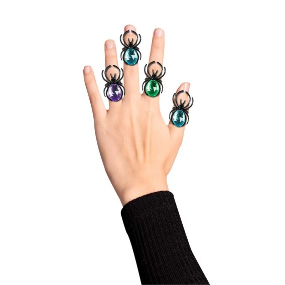 Pierścionki w kształcie pająków. Na pierścionkach znajduje się ozdoba imitująca mieniący się kryształ. Doskonałe jako uzupełnienie stylizacji z okazji halloween, balu przebierańców. W opakowaniu znajduje się mix kolorów. 4 sztuki w opakowaniu.