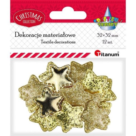 Dekoracje materiałowe, wzór: gwiazdki, wymiary: 35x32 mm, 3 wzory: drobny brokat, duży brokat, gładkie, kolor: złote. 12 sztuk.