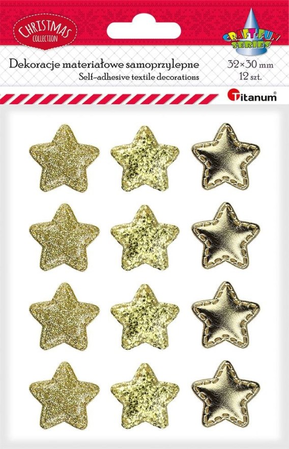 Dekoracje samoprzylepne materiałowe, wzór: gwiazdki PU, wymiary: 32x30 mm, 3 wzory: drobny brokat, duży brokat, gładkie, kolor: złote. 12 sztuk.