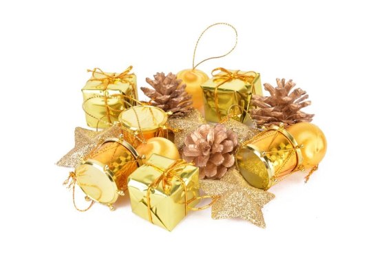 Zestaw 16 sztuk dekoracji o wymiarze: 3-4,5 cm do zawieszenia. W skład kompletu wchodzą: 3 dzwonki ozdobne, 3 szyszki, 3 bombki choinkowe, 3 prezenciki i 4 gwiazdki.