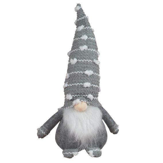 Skrzat dekoracyjny z puchatą brodą. Wykonany z miękkiego filcu i materiału w kolorze szarym. Dekoracja stojąca, dół ozdoby został obciążony, aby umożliwić stabilne jej postawienie. Skrzat ma długą, szpiczastą czapkę materiałową w wypukłe, miękkie kropki. Uniwersalna dekoracja świąteczna pasująca do każdego wnętrza lub ciekawy pomysł na prezent. Skrzat o wysokości 32 cm.