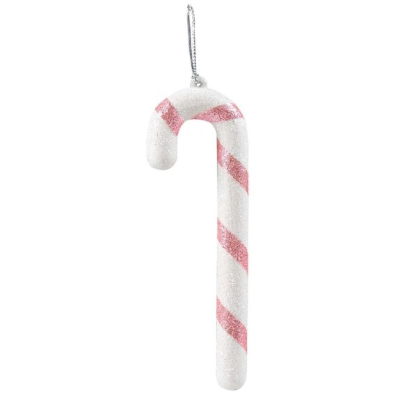 Brokatowa dekoracja świąteczna w kształcie laski cukrowej w kolorze białym z różowym pasem. Wykonana z tworzywa sztucznego, wyposażona w sznurek umożliwiający jej zawieszenie. W opakowaniu znajdują się 2 sztuki. Produkt o wymiarze 12 cm.