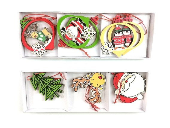 Zestaw 6 zawieszek świątecznych, drewnianych, 2 rodzaje, 25x8,5cm, Box