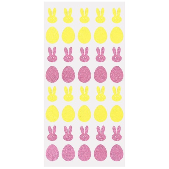 Piankowe naklejki brokatowe w kształcie zajączków i jajeczek. Idealne do dekoracji wielkanocnych, kartek świątecznych, prac szkolnych. Naklejki na blistrze o wymiarze 27x15 cm.