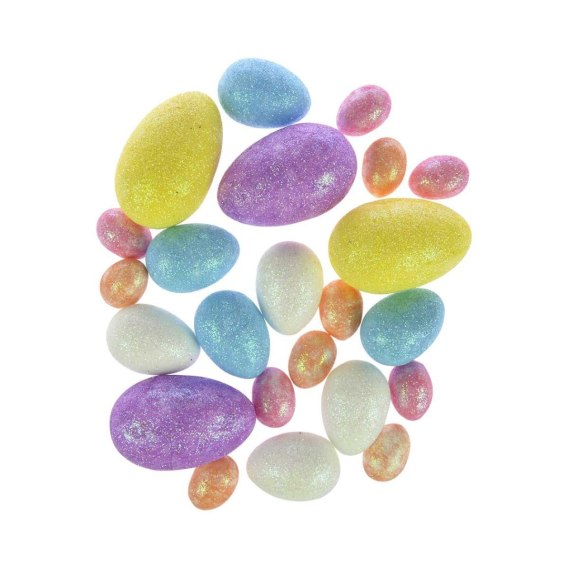 Pisanki wielkanocne z brokatem. W różnych rozmiarach, od 2,5 do 6 cm. Pakowane po 24 szt.