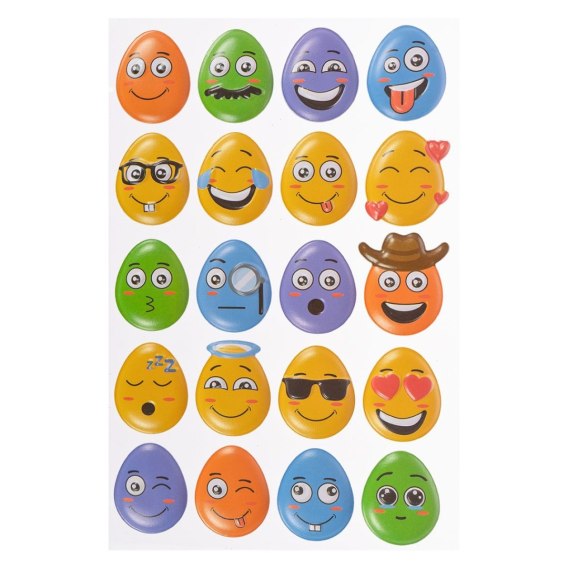 Zabawne naklejki z wesołymi buźkami. Naklejki w kształcie pisanek emotek. Śmieszny element do dekoracji kartek świątecznych, prac szkolnych.