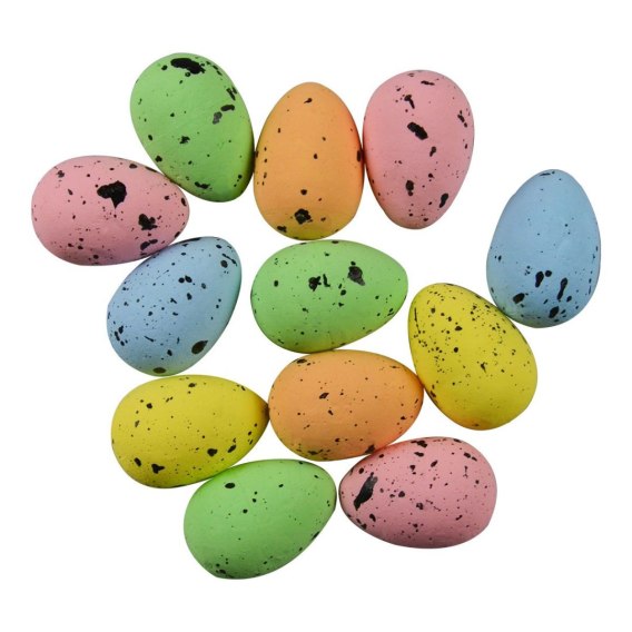Nakrapiane, kolorowe pisanki o wielkości 3.5 cm. Mogą stanowić idealne wykończenie wielkanocnego koszyczka lub dekoracji domu.