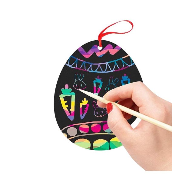 Pisanki zawieszki - zdrapki. Pod czarną warstwą kryje się multikolorowe tło.