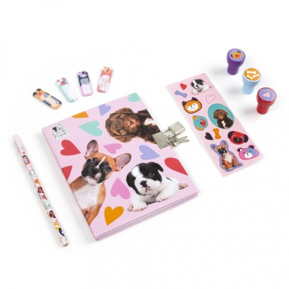 Zestaw składa się z pamiętnika, ołówka, 3 kolorowych stempelków z 3 różnymi motywami, arkusza z naklejkami oraz 4 arkuszy ozdobnych karteczek samoprzylepnych. Pamiętnik posiada kłódkę oraz 60 zadrukowanych kartek.