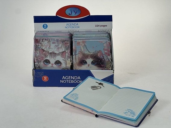 Pamiętnik z kłódką B6, 18x12,5cm, wzór koty, kartki w linie i czyste, display 12szt; 29x18,5x11cm, Box