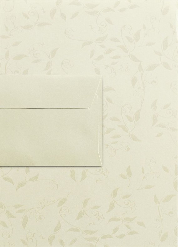 Papeteria kremowa Liana, opakowanie zawiera : 20 arkuszy papieru A4 z połyskującymi listkami + 10 sztuk kopert DL z papieru metalizowanego 120g/m2, papier polecany do drukarek laserowych i atramentowych, do korespondencji oraz zaproszeń okolicznościowych,