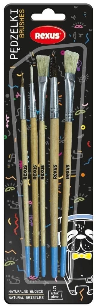 Zestaw okrągłych i płaskich pędzelków w różnych rozmiarach, doskonale nadających się na zajęcia plastyczne. Włosie pędzelka naturalne połączone bezszwowo z trzonkiem aluminiową skuwką. Opakowanie blistrowe: 5szt.