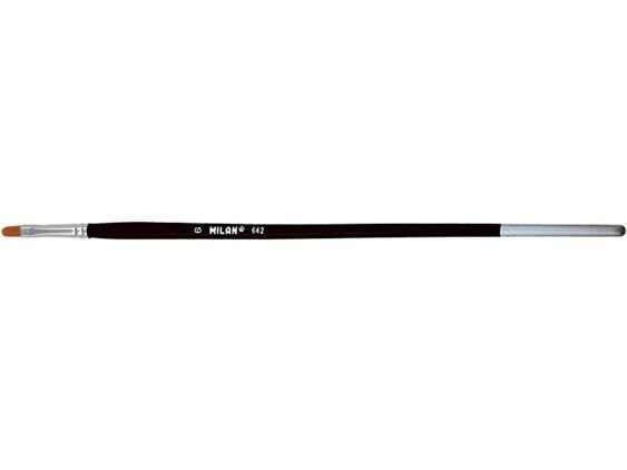 Pędzel syntetyczny serii 642 nr 16 z długim trzonkiem. Syntetyczne włosie wykonane z poliestrowych włókien o grubości 0,12 mm, miękkie i wytrzymałe. Zalecane do prac z farbami olejnymi i akrylowymi. Płaski pędzel w kształcie kociego języka z długim czarnym trzonkiem z polakierowanego drewna i matową posrebrzaną końcówką. Niklowana mosiężna skuwka, odporna na rdzewienie. Dedykowany dla plastyków. Szerokość włosia: 15,1 mm. Grubość włosia: 5,2 mm. Długość włosia: 21,9 mm. Długość pędzla: 307 mm.