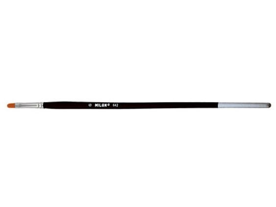 Pędzel syntetyczny serii 642 nr 18 z długim trzonkiem. Syntetyczne włosie wykonane z poliestrowych włókien o grubości 0,12 mm, miękkie i wytrzymałe. Zalecane do prac z farbami olejnymi i akrylowymi. Płaski pędzel w kształcie kociego języka z długim czarnym trzonkiem z polakierowanego drewna i matową posrebrzaną końcówką. Niklowana mosiężna skuwka, odporna na rdzewienie. Dedykowany dla plastyków. Szerokość włosia: 17,8 mm. Grubość włosia: 5,3 mm. Długość włosia: 22,7 mm. Długość pędzla: 313 mm.