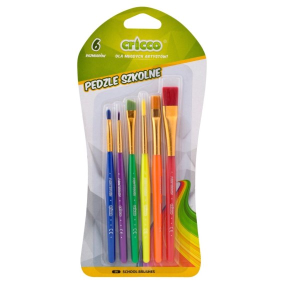 Komplet pędzelków szkolnych z kolorową akrylową rączką. Końcówki pędzelków wykonane są z syntetycznego włosia. Zestaw dostępny jest na blistrze i zawiera 6 sztuk pędzelków o różnych rozmiarach i kształtach końcówki. W zestawie zarówno okrągłe jak i płaskie końcówki.
