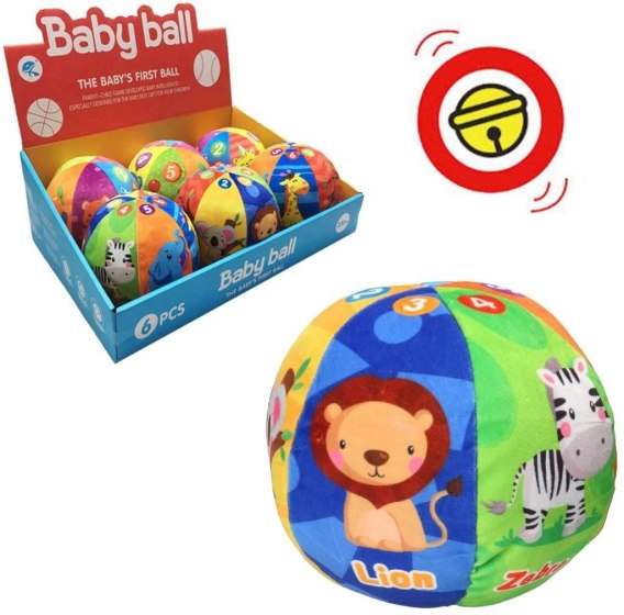 Miękka piłka materiałowa z dzwonkiem w środku przeznaczona dla dzieci powyżej 3 miesiąca życia.