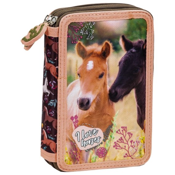 Piórnik podwójny z wyposażeniem. Posiada dwie komory zamykane na zamek, suwaki mają ozdobne zakończenia. W skład wyposażenia wchodzi: 10 kredek, temperówka, linijka, gumka do mazania, 2 ołówki, notesik, 10 pisaków, plan lekcji. Część wyposażenia ozdobiono grafikami z motywem bohaterów licencji.