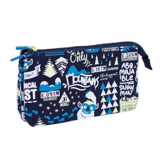 Piórnik saszetka z 5 komorami zapinany na 2 suwaki. Kolekcja YETI 2 powraca ze strasznym białym potworem pełnym odniesień do Himalajów. Na granatowym tle wyróżniają się białe ilustracje z detalami w kolorze żółtym i niebieskim. Materiał wierzchni i podszewka 100% poliester. Rozmiar: 22 x 12 x 4 cm.