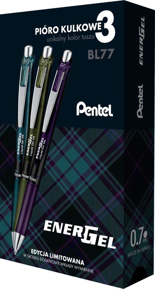 PIÓRO KULKOWE 0,7 MM ENERGEL Rewelacyjny tusz żelowy przyczynia się do podwyższania komfortu pisania. Nie rozmazuje się i nie brudzi, wysycha błyskawicznie. Pióro idealne dla osób leworęcznych. Metalowy klip i niezawodny system przyciskowy. Wyposażone w gumowy uchwyt, który działa antypoślizgowo. W 19 atrakcyjnych kolorach: czarnym, czerwonym, niebieskim, zielonym, brązowym, pomarańczowym, limonkowy, różowym, koralowy róż, błękitnym, fioletowym, lilia, magenta, burgund, żółty, szary, sepia, turkusowym i granatowy. Model ekologiczny, na wkłady wymienne LR7 (0,7 mm) lub LRN5 (0,5 mm). 3x BL77: Olive/Indigo/Bordeaux wkład wymienny 0,7 mm wkład wymienny 0,5 mm