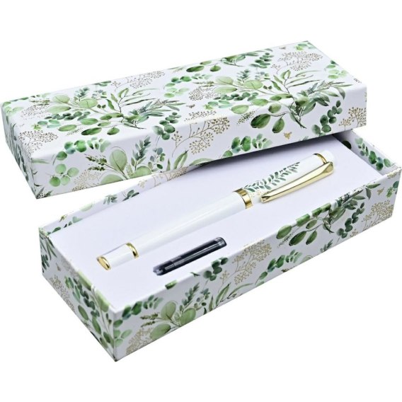 Doskonale wyważone pióro wieczne marki Peter Pauper Press - Eukaliptus (Eucalyptus). Posiada irydową stalówkę, która zapewnia trwałość, lekkość pisania i płynny przepływ tuszu. Grubość pisania pióra to F - 0,5 mm. Pióro posiada wielorazowy nabój z tłokiem (zwany konwerterem) do ładowania ulubionego tuszu, ale można też używać naboi jednorazowych - pierwszy jest dołączony do zestawu. Lakierowana konstrukcja z mosiądzu zapewnia solidność i wytrzymałość. Pióro jest zapakowane w gustowne pudełko zdobione tym samym wzorem. Wymiar opakowania 17,5 x 7 x 3,5 cm.
