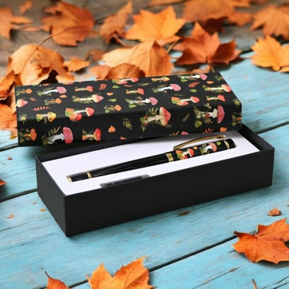 Doskonale wyważone pióro wieczne marki Peter Pauper Press - Grzyby (Mushrooms). Posiada irydową stalówkę, która zapewnia trwałość, lekkość pisania i płynny przepływ tuszu. Pióro posiada wielorazowy nabój z tłokiem (zwany konwerterem) do ładowania ulubionego tuszu, ale można też używać naboi jednorazowych - pierwszy jest dołączony do zestawu. Lakierowana konstrukcja z mosiądzu zapewnia solidność i wytrzymałość. Pióro jest zapakowane w gustowne pudełko zdobione tym samym wzorem. Wymiar opakowania 17,5 x 7 x 3,5 cm.