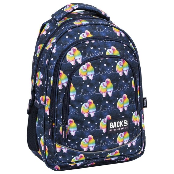 Wielobarwne papużki, które łączy silna, miłosna więź, tulące się na tle głębi granatu. Romantyczny i kolorowy - taki właśnie jest plecak BackUP z kolekcji Love! Połączenie intensywnych barw zieleni, fioletu i granatu tworzy niezwykłą, radosną kompozycję. To plecak dla dziewczynki, którą miłość inspiruje do wszystkiego co piękne! Plecak BackUP posiada: - 3 komory