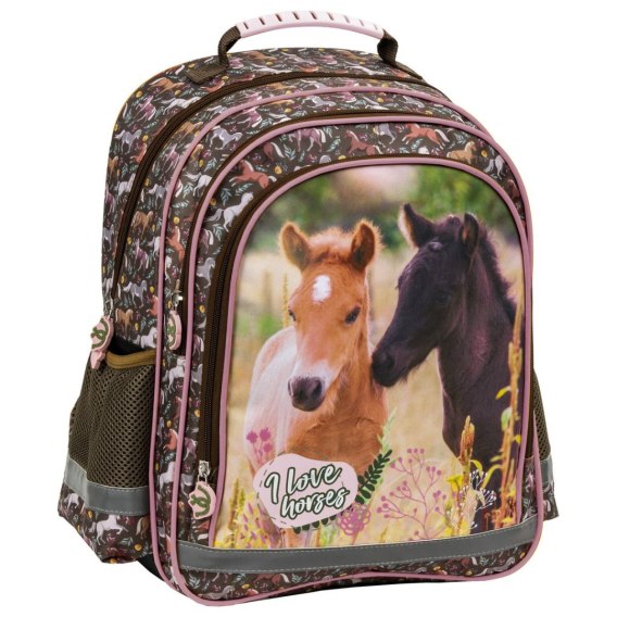 Dwukomorowy plecak szkolny z obszerną kieszenią przednią. Po bokach znajdują się dwie boczne kieszonki wykończone siatką. Plecak posiada miękkie wyściełane szelki, ergonomiczne plecy, taśmy odblaskowe, wzmacnianą rączkę oraz wzmocnione dno.