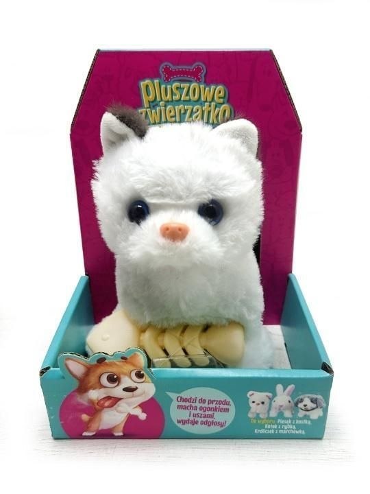 Chodzący kotek z rybką to interaktywna zabawka, która z pewnością oczaruje małych miłośników zwierząt. Pluszak o wysokości 15 cm porusza się do przodu, energicznie macha ogonkiem i głową, a przy tym wydaje zabawne odgłosy, które sprawiają, że wygląda jak prawdziwy kociak. W zestawie znajduje się rybka, którą kotek traktuje jak swój ulubiony smakołyk. Dzięki tym funkcjom zabawa staje się jeszcze bardziej realistyczna i wciągająca, a dzieci mogą poczuć się jak opiekunowie domowego pupila. Produkt zapakowany jest w kolorowe pudełko o wymiarach 18,5 x 13,5 x 18 cm. Zabawka działa na baterie 2 x AA (niedołączone) i przeznaczona jest dla dzieci od 3. roku życia.