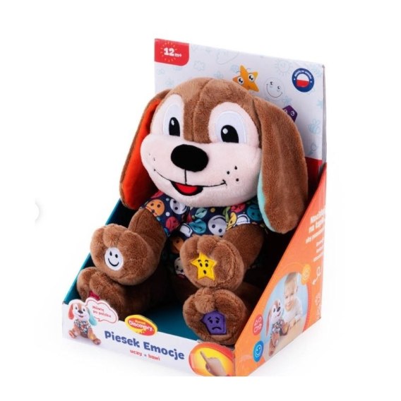 "Ten uczuciowy psiak nauczy dzieci rozpoznawania i nazywania emocji! Każda z jego czterech miękkich łapek kryje w sobie inne uczucie, kształt oraz kolor. Naciśnij na jedną z nich, a piesek w przystępny sposób wytłumaczy jak zachowujemy się kiedy czujemy daną emocję, a także do czego można przyrównać kształt kryjący się na łapce oraz kolor. Towarzyszą temu miłe dla ucha piosenki, z pomocą których najmłodszym łatwiej będzie zapamiętać przekazane przez pieska informacje. Zabawka posiada świecące serduszko, a jej łapki wyposażone są w opcję włącz/wyłącz.