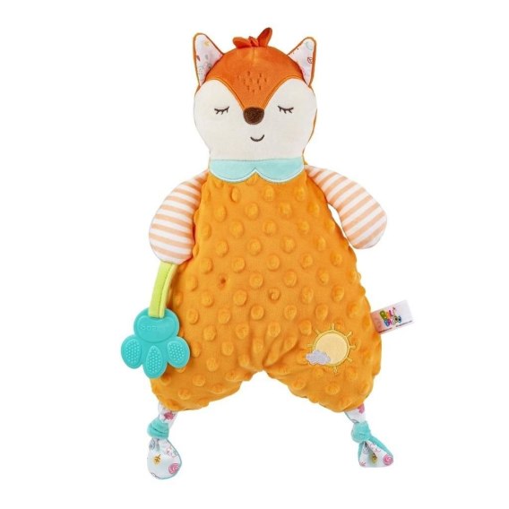 Mięciutka porcja sensorycznej radości! Ten milusi lisek to kandydat na idealną przytulankę. Uszyty został z materiałów różniących się kolorem, wzorem i fakturą, dzięki czemu, podczas zabawy, stymulować będzie zmysły malucha, pomagając mu tym samym w rozwijaniu zdolności poznawczych. Nóżki zwierzaka tworzą zabawne supełki, a jego ciałko zdobi uroczy haft w kształcie słoneczka z chmurką. Zabawka wyposażona została w praktyczny dodatek, jakim jest gryzak listek, który z pewnością przyda się każdemu ząbkującemu bobasowi.