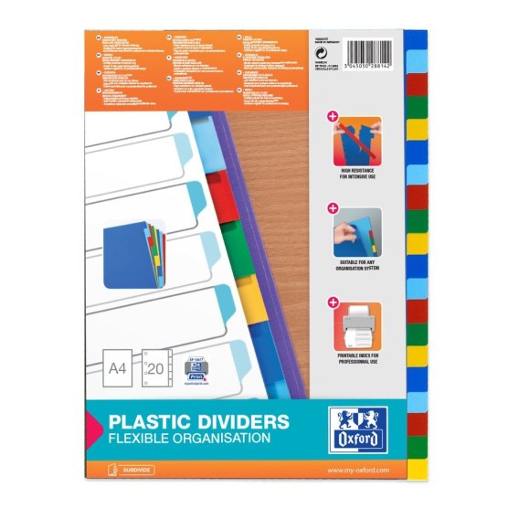 Kolorowe przekładki wykonane z wytrzymałego polipropylenu odpornego na zniszczenie - doskonałe do organizowania dokumentów w segregatorze. Komplet zawiera 20 przekładek z niezadrukowanymi indeksami. Na pierwszej karcie umieszczono specjalne miejsca do opisu zawartości.