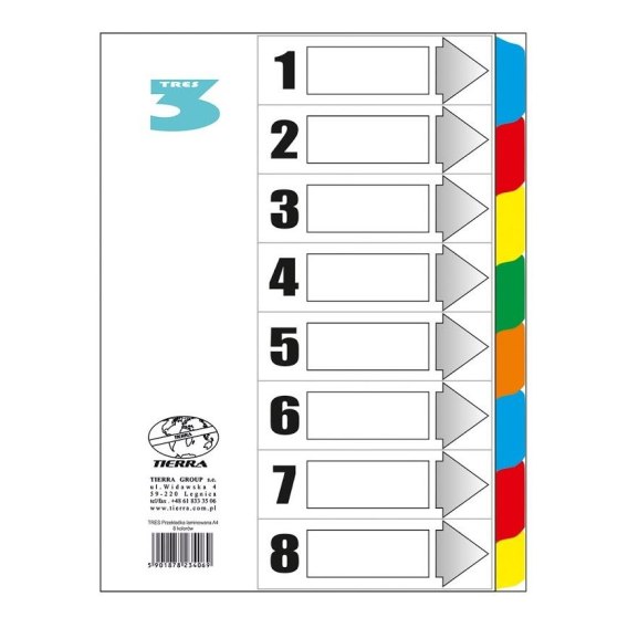 TRES Przekładka kart. laminowana A4 - 8 kolorów, format A4.