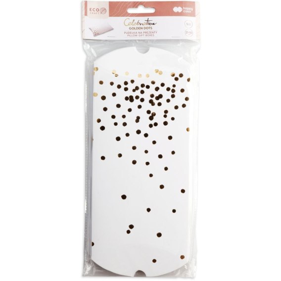 Pudełka ozdobne na prezenty z białego kartonu ze złotymi swobodnie rozrzuconymi plamkami. Pakowane w jednym rozmiarze lub zestawach. Wymiary 21 x 10 cm lub 15 x 8 cm. Ilość w opak. – 5 szt. (jeden rozmiar), 3 szt. (mix).