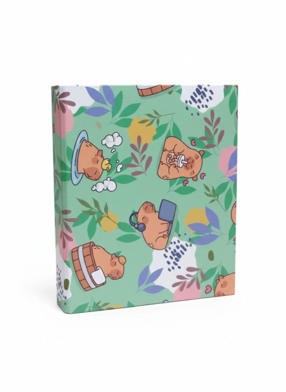 Wykonany z tektury 1,9 mm. Wzorzysta okleina uszlachetniona nierysującą, matową folią polipropylenową,Szerokość grzbietu: 4 cm. Mechanizm dwuringowy. Wymiary w cm: 19,5x23.