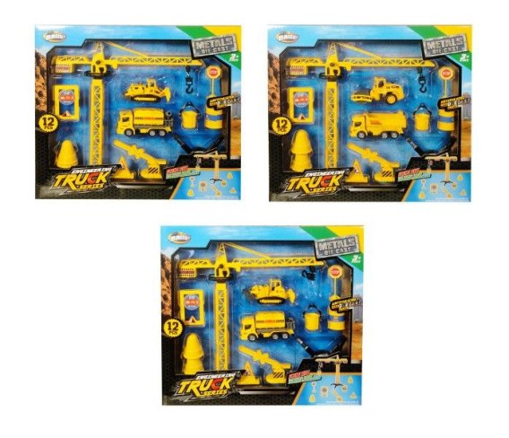 Zestaw metalowych pojazdów budowlanych z dźwigiem wraz z akcesoriami takimi jak: znaki drogowe, szlaban. Dzięki temu zestawowi obszar zabawy dzieci zamieni się w plac budowy. Zabawka zapakowana w kartonowe opakowanie z przezroczystym okienkiem. Podane wymiary są wymiarami opakowania. Zabawka dla dzieci od 3 lat.