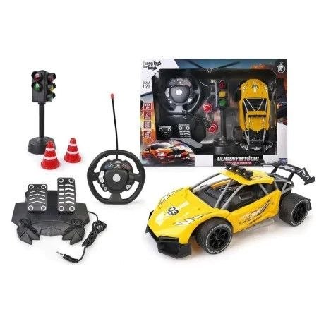 W zestawie: - auto dł: 23 cm - kierownica - pedały - sygnalizator świetlny - 2 pachołki Funkcje: - 2 tryby sterowania samochodem - kierownica oraz kierownica+pedały - skręca się poprzez przekręcanie kierownicą - pełny zakres jazdy - ustawienie zbieżności kół - sygnalizator - po naciśnięciu przycisku podświetlają się diody na kolory zielony, żółty, czerwony,