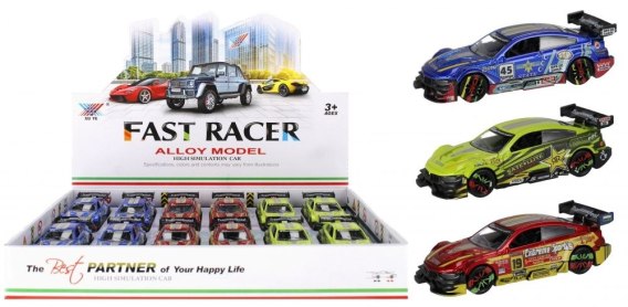 Zalety produktu: Auta wyścigowe w trzech kolorach: czerwonym, zielonym, niebieskim. Solidnie wykonane auto metalowe MEGA CREATIVE , to idealny sposób na świetną zabawę . Auto wykonane w większości z metalu dzięki czemu wytrzyma wszystkie przeszkody jakie napotka na torze wyścigowym. Posiada funkcję pull back, dzięki czemu po naciągnięciu kółek do tyłu auto kontynuuje jazdę samodzielnie do przodu Zawartość zestawu: auto wyścigowe 11 cm. Całość wykonana z metalu i gumy Wymiary/waga/baterie: Wymiary produktu dł. x wys. x gł. cm 11x3x5. Waga produktu bez opakowania kg. 0,06 kg, Wymiary opakowania produktu display dł. x wys. x gł. cm 38x5x37. Waga produktu w opakowaniu display kg. 0,94 kg. Nie wymaga zasilania bateriami. Produkt przeznaczony dla dzieci od lat: 3 . Pakowany w display po 12 szt... Pakowanie w kartonie zbiorczym po 144/288 szt.