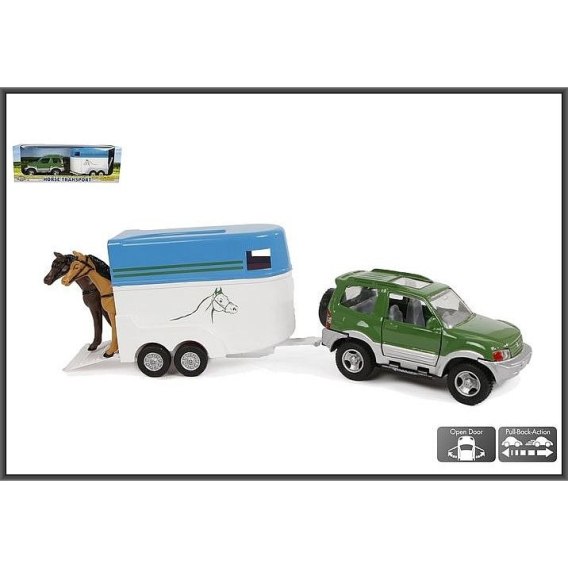 Auto metalowe 12x5x5cm z napędem i z otwieranymi drzwiami , w zestawie z przyczepą do transportu koni 11x8x6cm i z dwoma końmi 7cm .