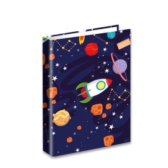 Wykonany z tektury 1,9 mm. Okleina uszlachetniona błyszcząca folią polipropylenową. Szerokość grzbietu 4 cm. Mechanizm dwuringowy.