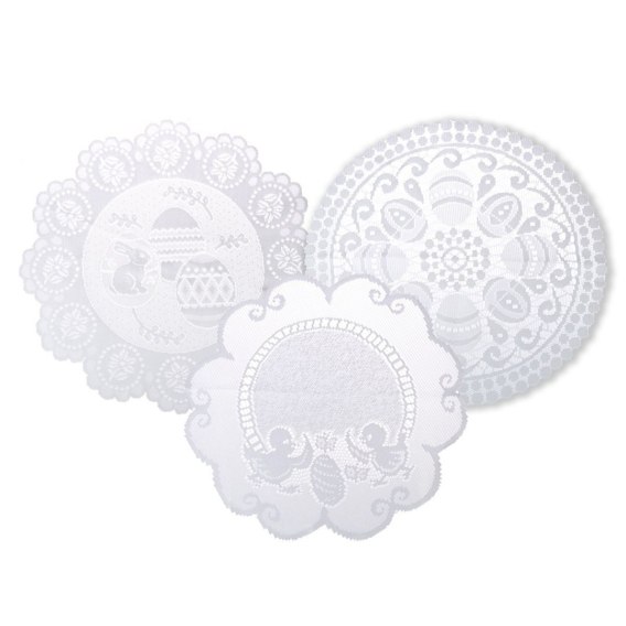 Wielkanocna serwetka dekoracyjna na koszyczek. Serwetka osłania żywność w koszyczku oraz pełni formę świątecznej dekoracji. Ażurowe wzory nawiązują to tradycyjnych motywów. Duża serwetka o średnicy 40 cm. Dostępne 3 wzory.