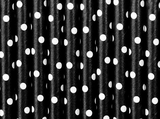 Słomki papierowe w kolorze czarnym z białymi małymi kropkami, długość około 19,5 centymetra.