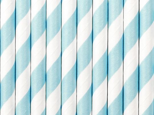 Słomki papierowe w kolorze błękitnym z białymi ukośnymi paskami, długość około 19,5 centymetra.