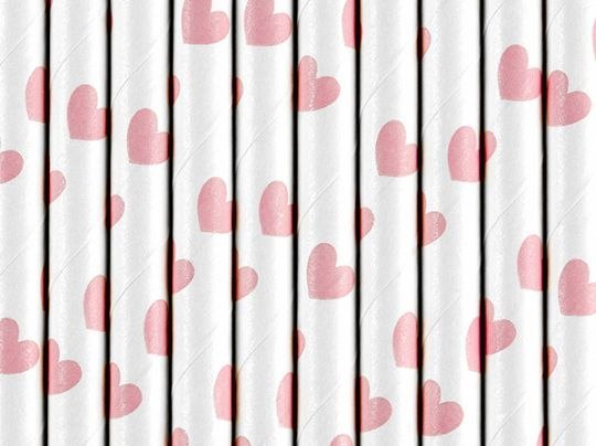 Słomki papierowe w kolorze białym z jasnoróżowymi sercami, długość około 19,5 centymetra.