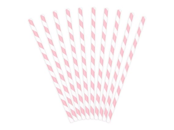 Słomki papierowe w kolorze jasnoróżowym z białymi ukośnymi paskami, długość około 19,5 centymetra.