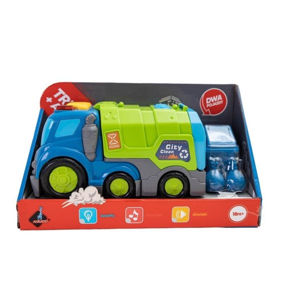 Zestaw 2w1 Śmieciarka i pojemnik na śmieci Śmieciarka z napędem friction (23x11x12 cm) Efekty świetlne i dźwiękowe Zasilanie: 2xAA (brak w zestawie)