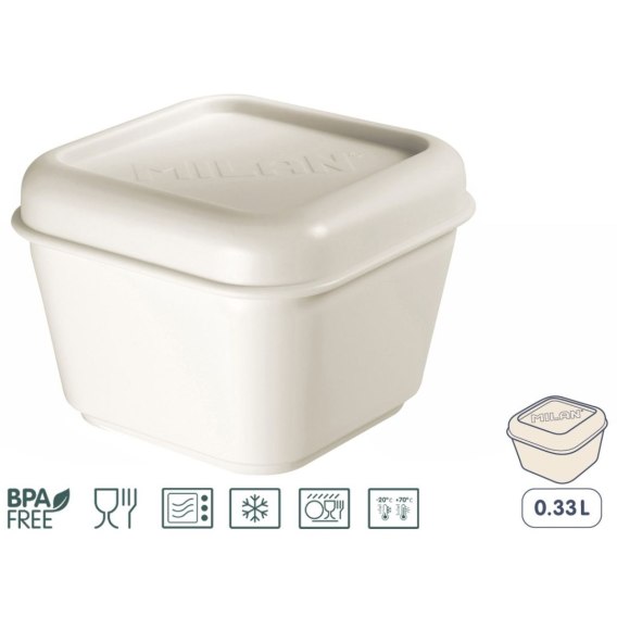 Kwadratowy biały pojemnik na lunch z białą pokrywką. Nadaje się do podgrzewania w kuchence mikrofalowej (maks. 70?C) z otwartą pokrywą w celu uwolnienia pary. Nadaje się także do przechowywania w zamrażarce (do -20?C) oraz do mycia w zmywarce do naczyń (maks. 70?C). Pokrywy i pojemnik można łatwo łączyć ze sobą. Matowe zewnętrzne wykończenie ułatwia uchwyt. Wnętrze z zaokrąglonymi narożnikami i błyszczącym wykończeniem dla lepszego czyszczenia. Materiał: tworzywo sztuczne wolne od BPA. Rozmiar: 10 x 10 x 7,4 cm. Pojemność: 0,33 litra.