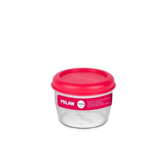 Przezroczysty okrągły pojemnik na żywność wykonany z tworzywa sztucznego Tritan. Różowa zakrętka z hermetyczną uszczelką. Trwała, nadająca się do ponownego użycia i recyklingu. Odporny na temperatury od -20°C do 80°C. Nie zawiera BPA. Nie zatrzymuje zapachów i smaków. Nadaje się do kuchenki mikrofalowej (maks. 80°C) z otwartą pokrywą, aby wypuścić parę. Nadaje się do zamrażarki. Nadaje się do mycia w zmywarce (maks. 80°C). Pokrywy i pojemniki można łatwo ustawiać jeden na drugim. Seria MILAN nata® 624 inspirowana jest oryginalną kolorystyką i designem gumek MILAN produkowanych w Hiszpanii od 1918 roku. Wymiary: 12 Ř x 9,2 cm. Pojemność: 0,5 L.