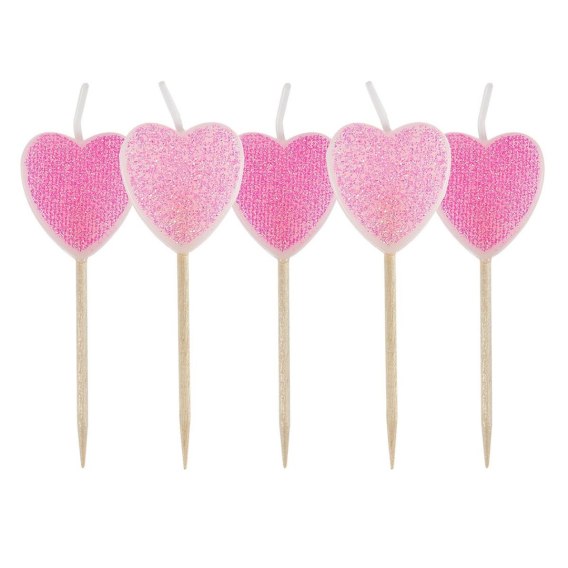 Zestaw 5 świeczek w kształcie serc w dwóch odcieniach różowego z brokatem. Świeczki na piku, łatwe do umieszczenia na torcie, babeczkach. Dekoracja słodkiego stołu, przyjęcia z okazji walentynek, rocznicy, urodzin. Wymiary świeczki: 2,5 x 2,3 x 0,6cm.