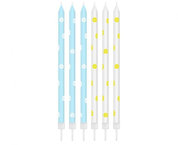 ŚWIECZKI NA TORT STOKROTKI Kolor: biały, niebieski, żółty Wzór: stokrotki Wysokość świeczek : ok. 10 cm Ilość sztuk w opakowaniu: 5 Producent: Godan S.A